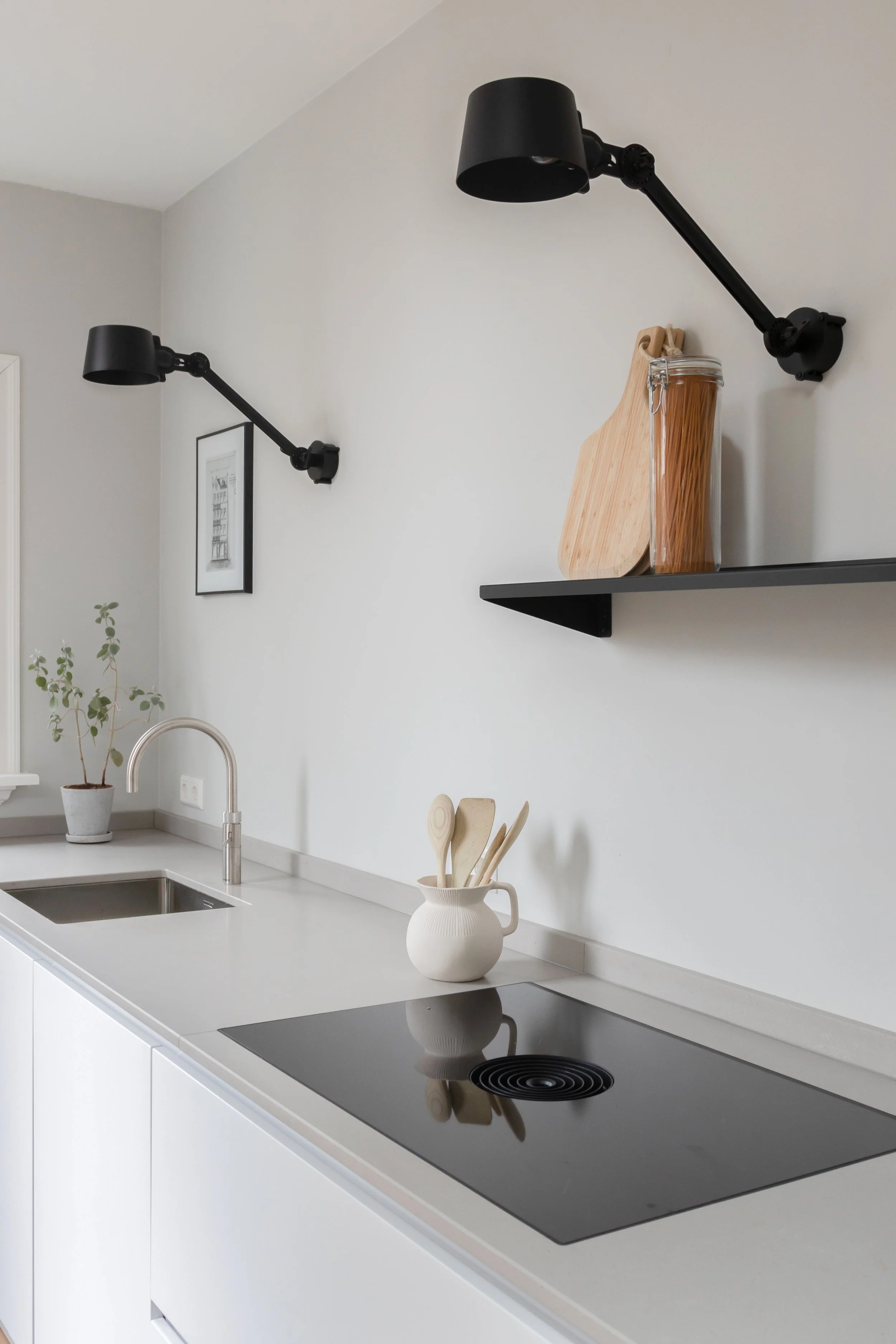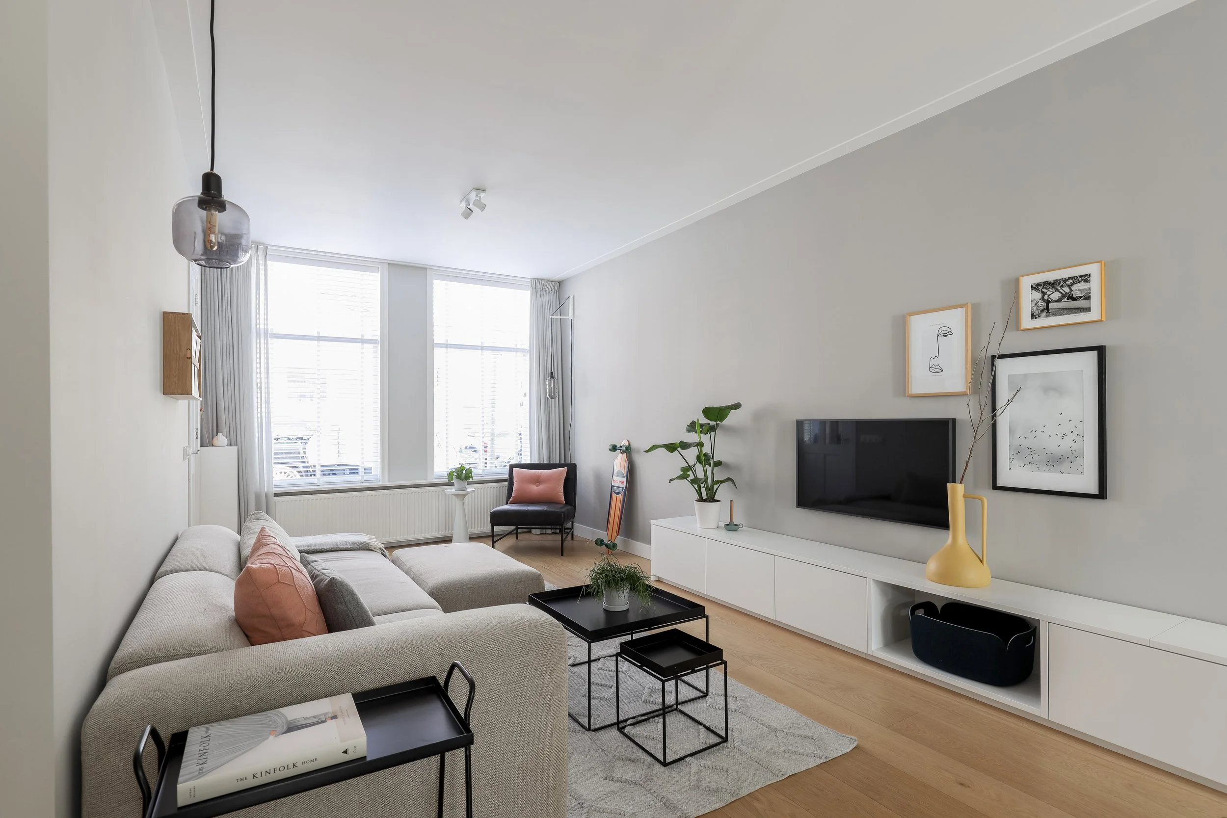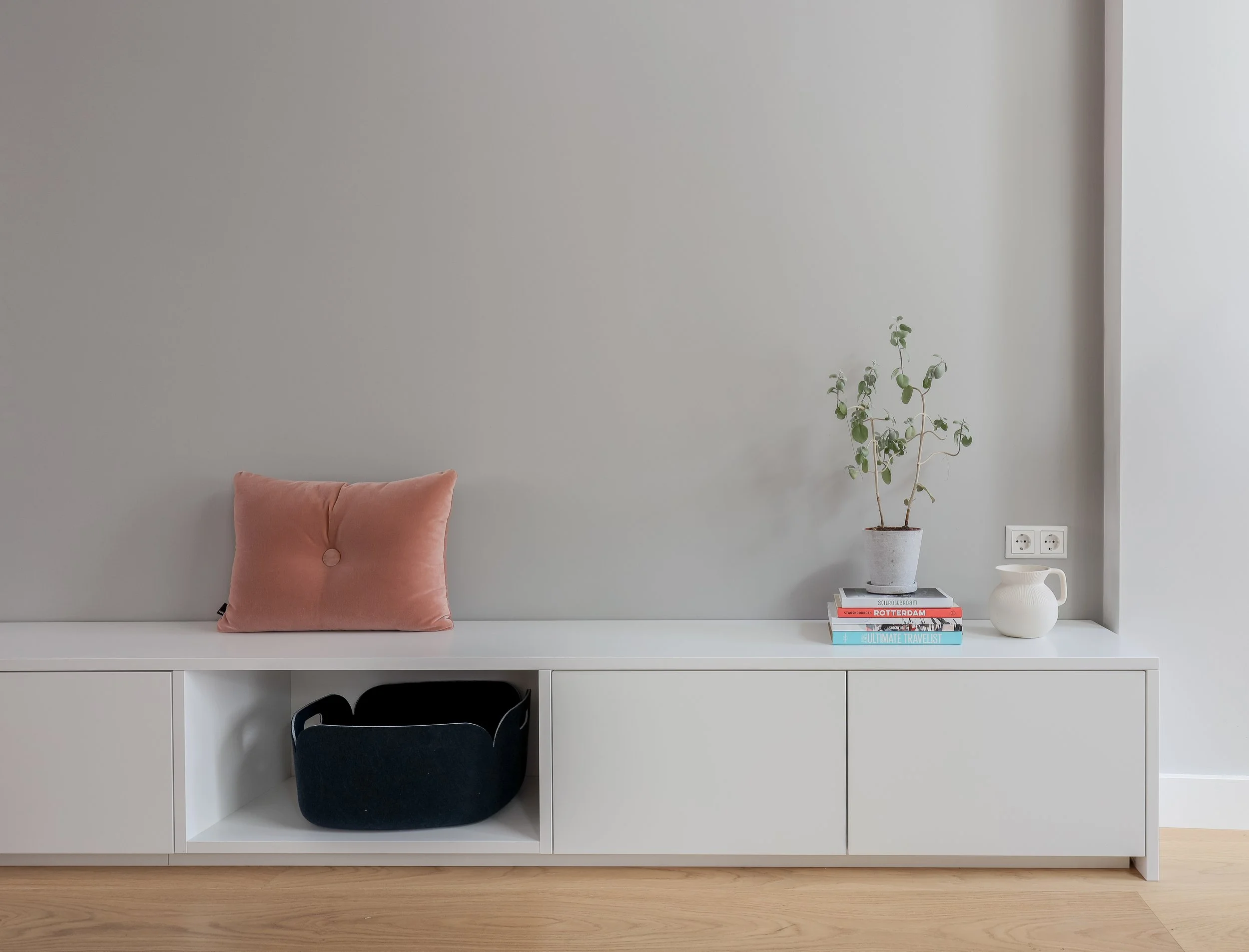Een stadswoning in Haarlem, waar ik de begane grond volledig mocht van ontwerpen, inclusief een lange kastenwand op maat. De rustige kleuren en een subtiele touch van geel zorgen voor een lichte en warme sfeer. Voor de eerste verdieping ontwierp ik maatwerk voor zowel de badkamer als de slaapkamer, afgestemd op de wensen van dit leuke jonge stel.