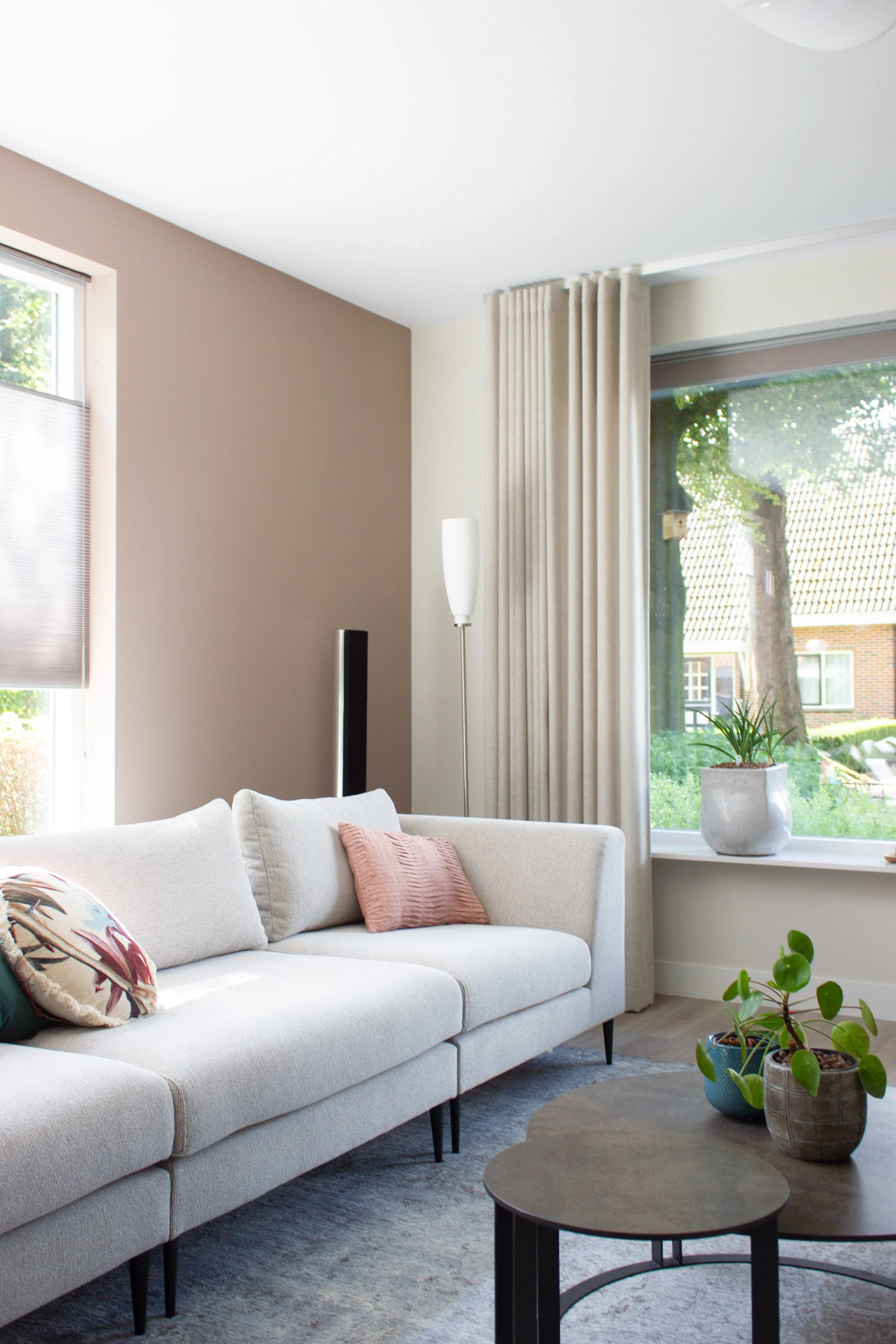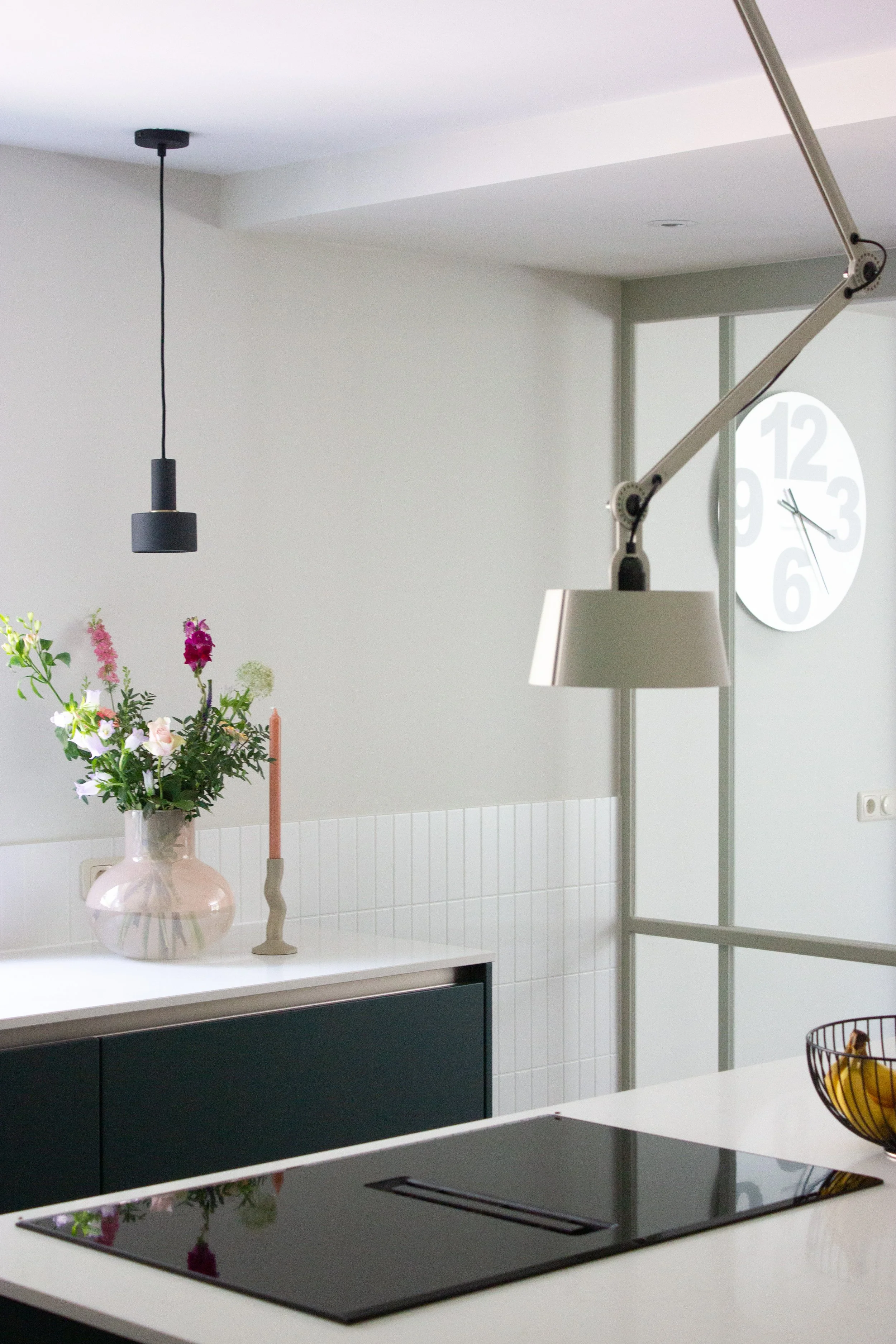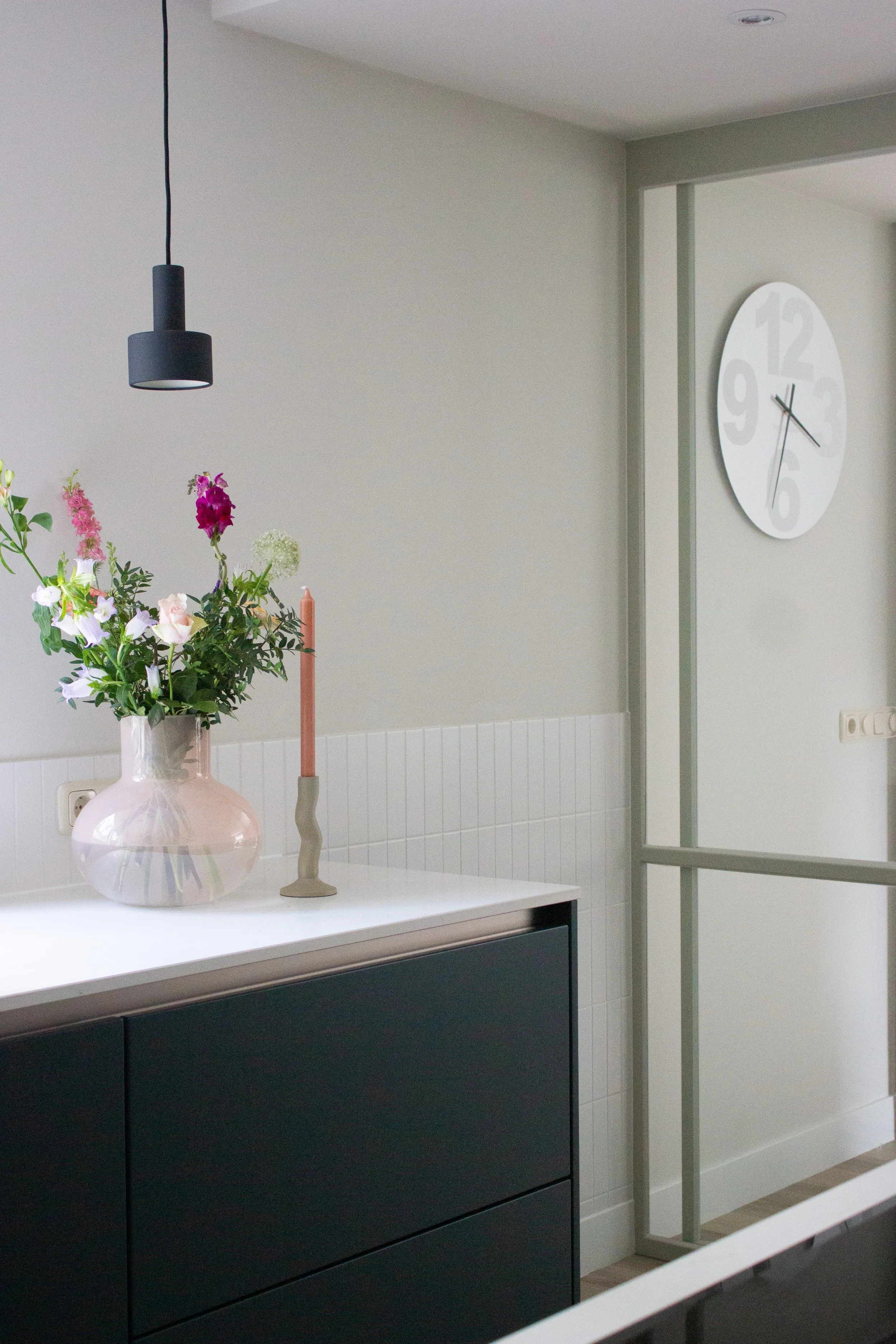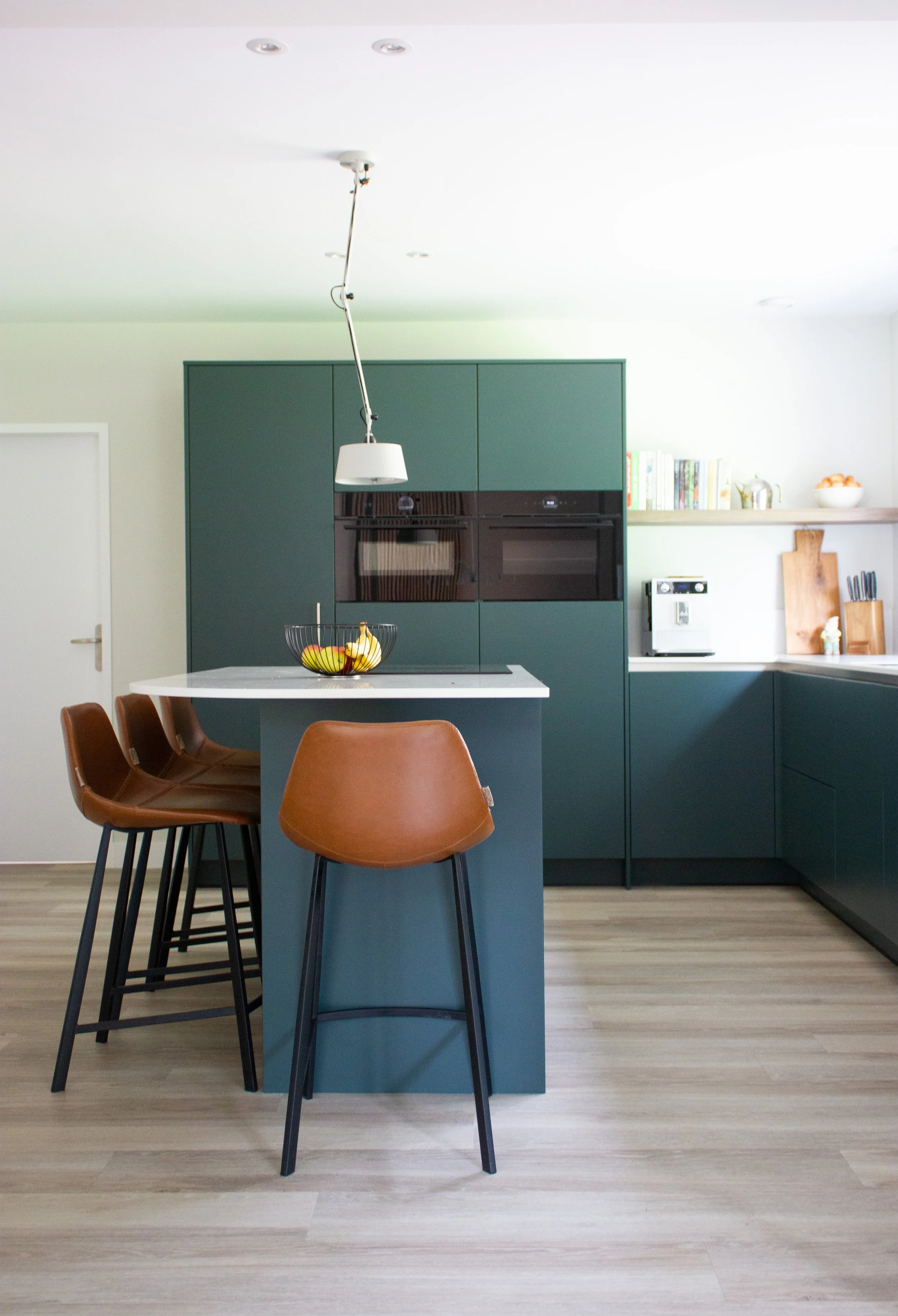 Voor een ruime, vrijstaande woning in Putten mocht ik het ontwerp verzorgen voor de gehele begane grond. De bewoners, een gepensioneerd stel, wilden een warm en harmonieus thuis waarin bestaande meubels werden gecombineerd met nieuwe elementen. Een grote maatwerkkast loopt door van de woonkamer naar de keuken en zorgt voor een gevoel van eenheid in de ruimte. De basis is licht en rustig, met uitgesproken accenten zoals de groene keuken die het geheel net dat beetje extra geeft.